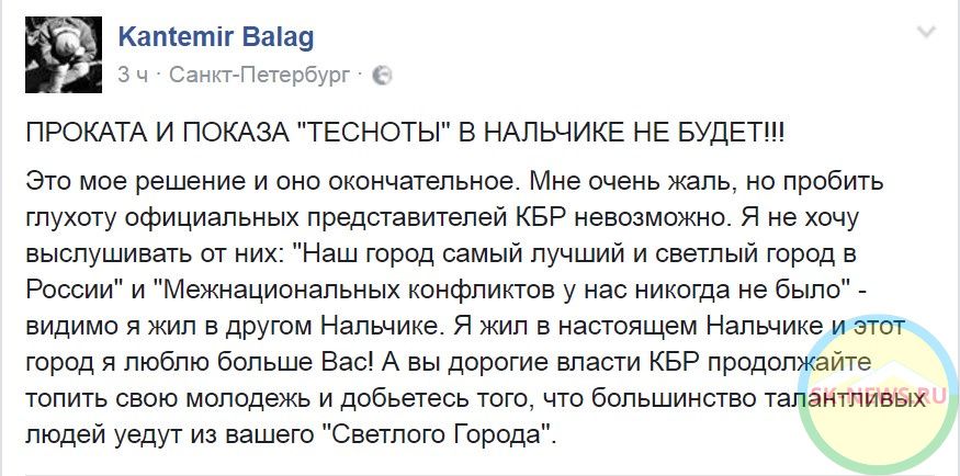 ПРОКАТА И ПОКАЗА "ТЕСНОТЫ" В НАЛЬЧИКЕ НЕ БУДЕТ!!!
