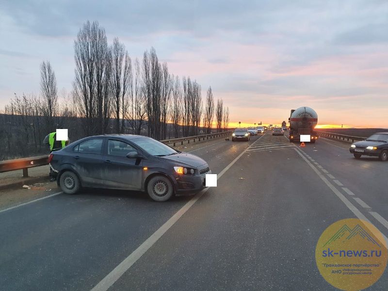 В 6.45 среды 27 января на автодороге «Северный обход» Шпаковского района водитель иномарки выезжал со стороны города на виадук и не предоставил преимущество грузовику. Произошло касательное столкновение «Шевроле Авео» с грузовым автомобилем в сцепке с цистерной, в момент ДТП она была пуста. Хорошо, что никто не пострадал.