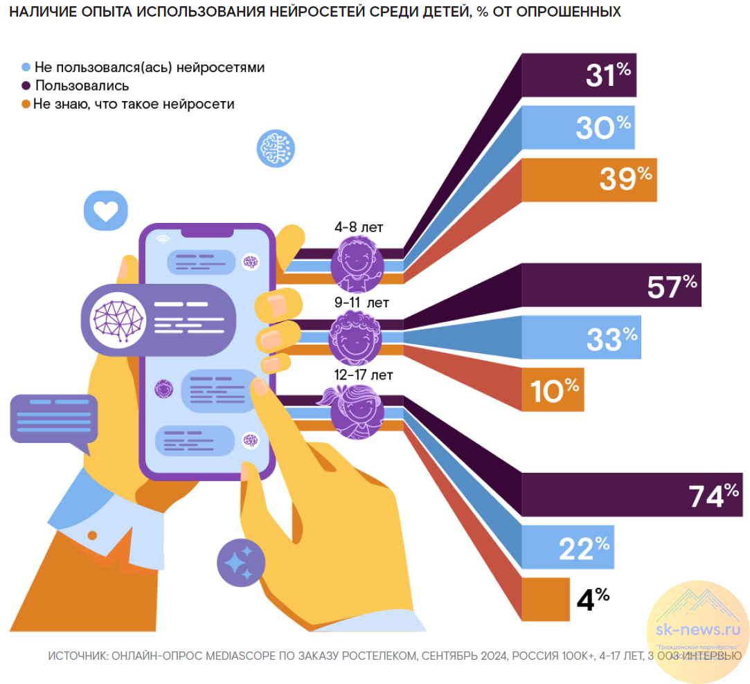Поколение Альфа с рождения находится в тесном контакте с новыми технологиями — искусственным интеллектом, голосовыми помощниками, VR и другими. К концу 2024 года уже более половины детей и подростков использовали нейросети (ИИ) для решения различных задач, из них более 80% с помощью чат-ботов. Голосовыми помощниками пользуются свыше 80% детей и подростков 4–17 лет, включая интегрированных в умные колонки ассистентов (эти устройства есть более чем в 40% семей с детьми-участниками исследования). Младшие дети (рожденные после 2014 года) активнее пользуются голосовыми помощниками, чем подростки, так как они родились, когда умные колонки уже получили широкое распространение. Современные дети рано начинают в той или иной степени соприкасаться с финансовыми сервисами: банковские карты есть у половины школьников. И здесь возникает свой пласт рисков — от мошенничества до вовлечения в дропперство.