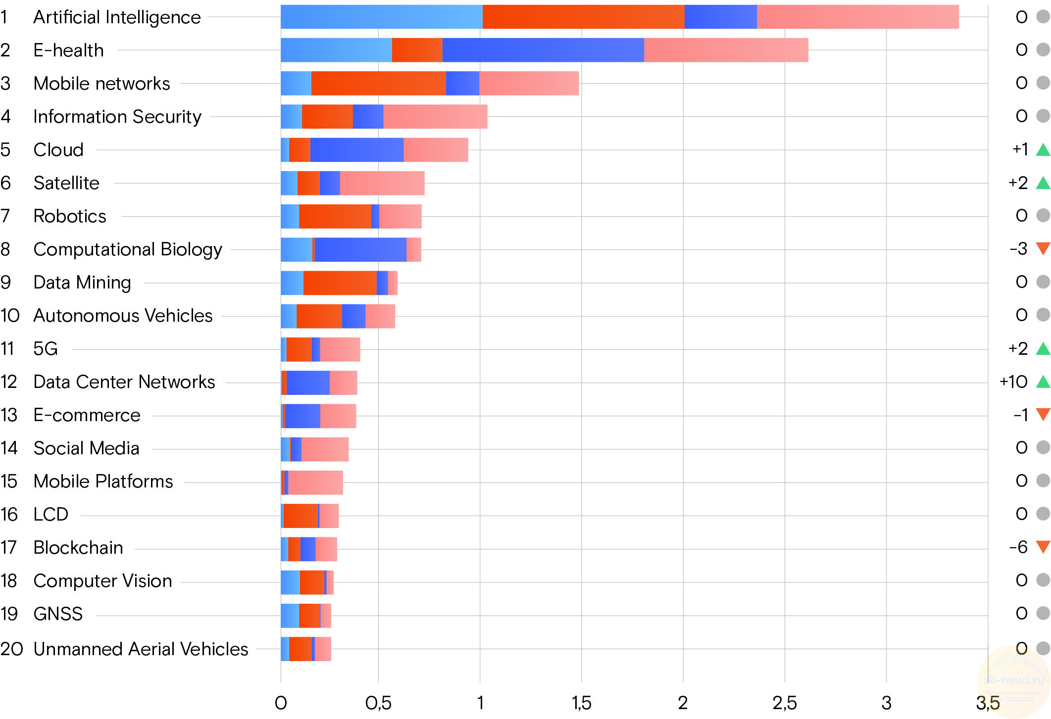 Как всегда, для исследования проводится анализ максимального объема открытых и закрытых источников информации, с которыми работает российское программное обеспечение TeqViser от «Ростелекома». Для нового исследования были проанализированы данные из 79,6 млн научных публикаций, 54 млн патентов и 2,8 млн публикаций в профессиональных медиаисточниках, а также около 1 млн сделок на общую сумму свыше 40,6 трлн долларов США.