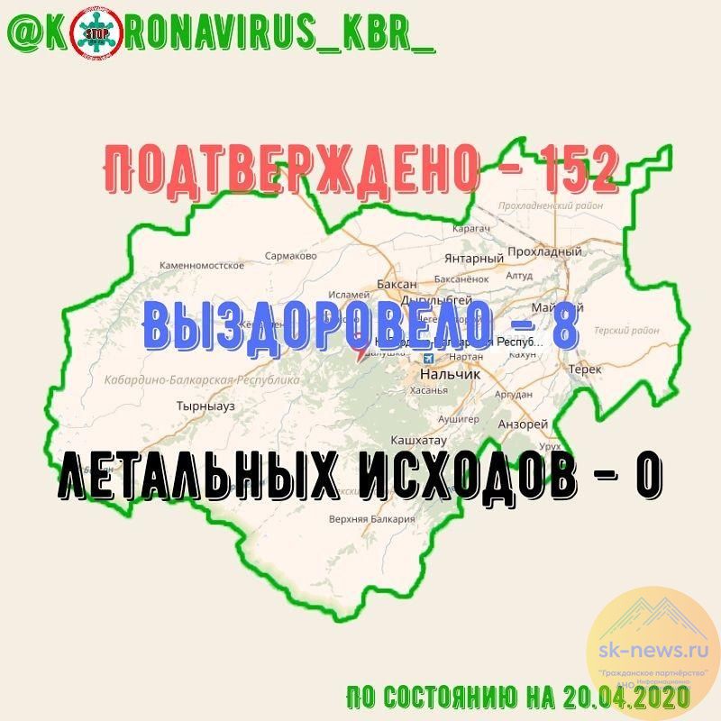 По состоянию на 20 апреля в Кабардино-Балкарии зарегистрировано 152 подтвержденных случая #COVID19, сообщает SK-NEWS.RU со ссылкой на республиканский оперативный штаб.