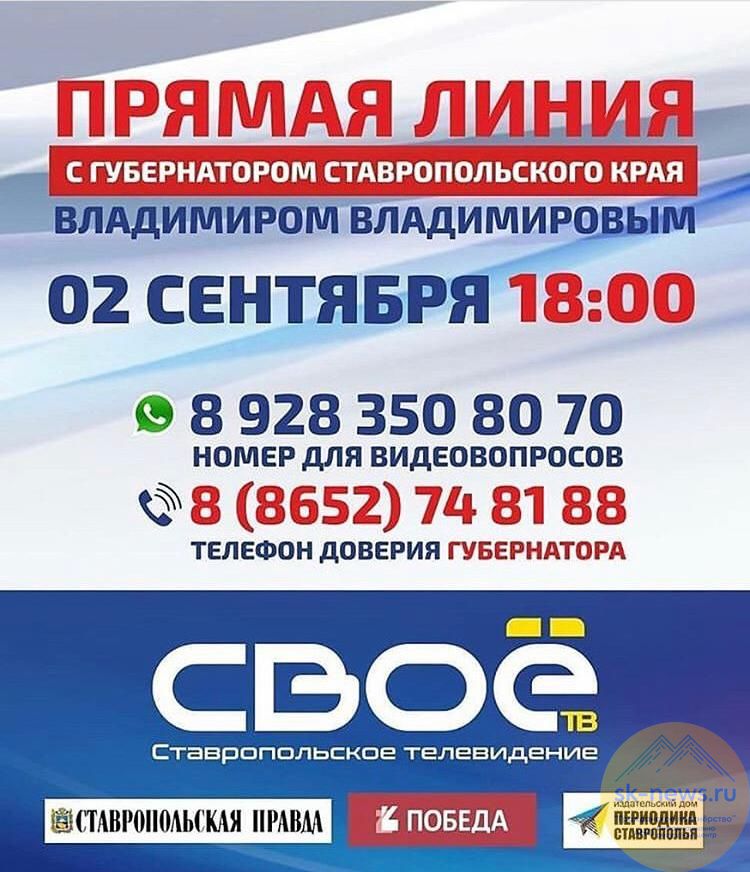 Губернатор Ставрополья Владимир Владимиров подведёт итоги лета и ответит на актуальные вопросы в эфире «прямой линии». Трансляция запланирована 2 сентября в 18:00 на телеканалах «СвоёТВ» и ОТР, сообщили SK-NEWS.RU в пресс-службе главы края.