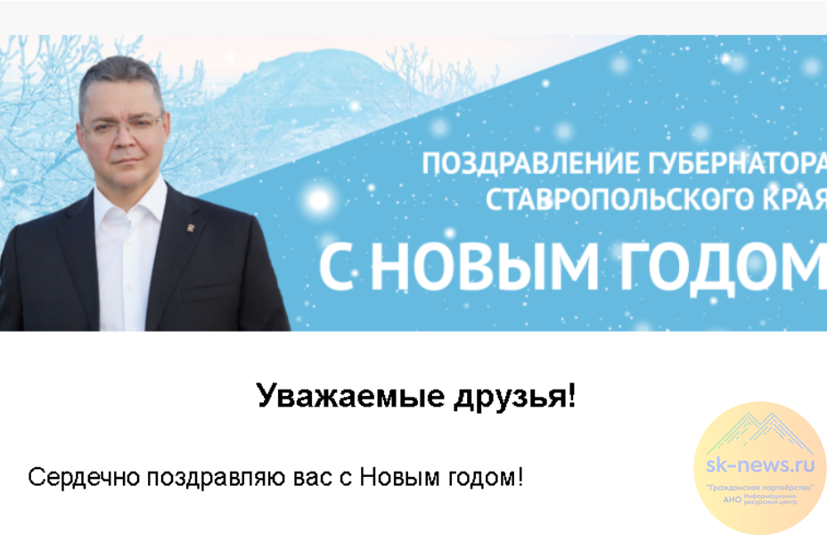 Владимир Владимиров пожелал ставропольчанам, чтобы новый год умножил достижения и победы страны. От души губернатор пожелал людям крепкого здоровья, счастья и благополучия, новых достижений на благо Отечества, сообщает SK-NEWS.RU со ссылкой на его пресс-службу.