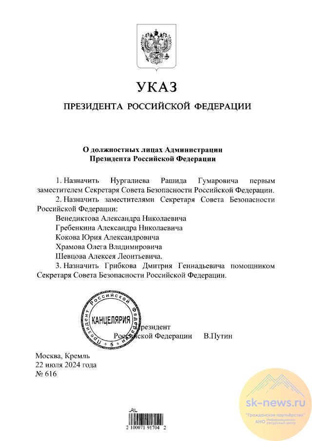 Рашид Нургалиев переназначен первым заместителем секретаря Совета безопасности РФ.
