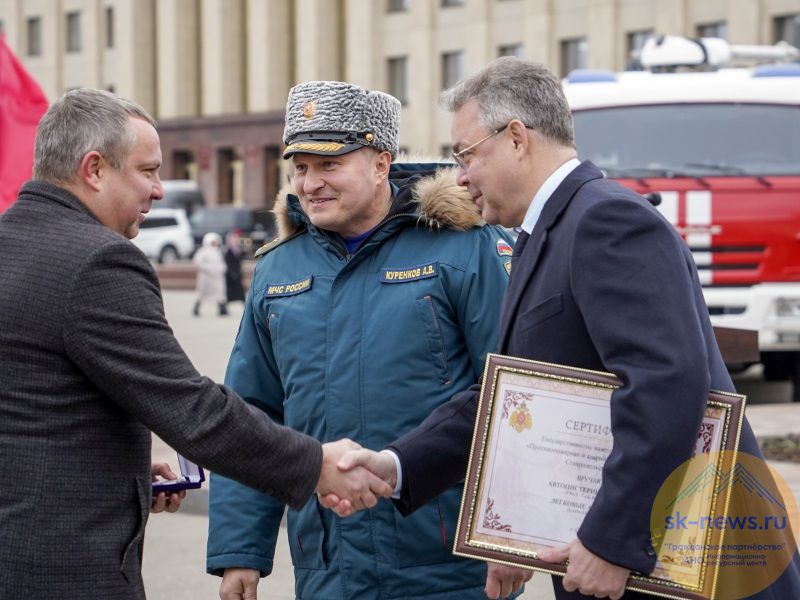 Министр РФ по делам гражданской обороны, чрезвычайным ситуациям и ликвидации последствий стихийных бедствий Александр Куренков в пятницу 6 декабря находится с рабочим визитом в регионе. С губернатором Владимиром Владимировым в Ставрополе он передал сертификаты и ключи от специальной и аварийно-спасательной техники подразделениям краевого управления МЧС, противопожарной и аварийно-спасательной службы края (ПАСС СК).