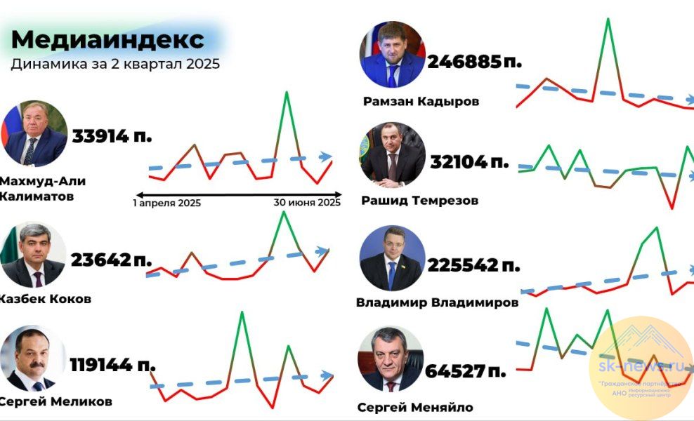 После тройки лидеров в рейтинге идет глава Северной Осетии Сергей Меняйло (64 527 пунктов МИ). Он активно освещал последствия атаки беспилотников ВСУ на регион, обсуждал развитие туризма с Премьер-Министром РФ Михаилом Мишустиным. События сформировали устойчивый информационный след его персоне. На предпоследнем месте медиарейтинга – глава КЧР Рашид Темрезов с 32104 пунктами МИ. Рост его медиаиндекса связан с визитом детского омбудсмена РФ Марии Львовой-Беловой, с которой обсудили поддержку детей-сирот, и участием в международной выставке «Сады России 2025», где республика показала достижения.