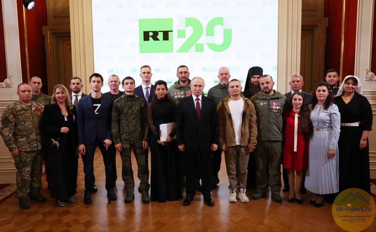 На торжественном мероприятии в честь 20-летия телеканала RT Президент России Владимир Путин встретился с героями документальных проектов о специальной военной операции.