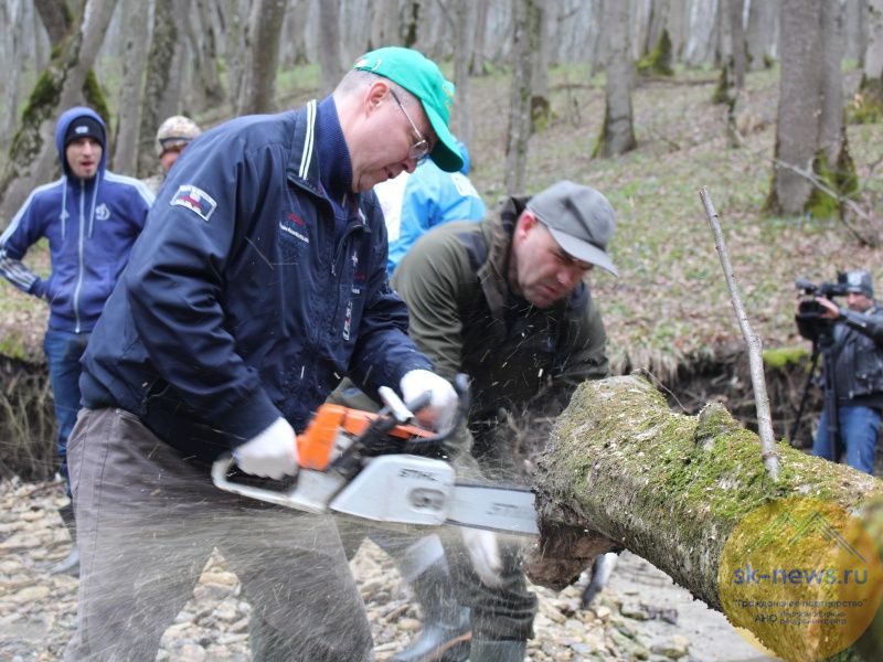 Субботник прошел сразу на нескольких площадках: сначала общими усилиями очистили от мусора берега реки Грушевой. Место проблемное: местные жители и отдыхающие во время прогулки не стесняются выбрасывать обертки, бутылки и прочий мусор. Все отходы были собраны и упакованы в мешки. Продолжилась эко-акция более тяжело – расчисткой русла реки от валежника и покрышек. По словам начальника ГКУ «Ставропольское лесничество» Сергея Зенченкова, это важная работа. Чем больше загрязнено русло реки, тем сильнее подмыв деревьев, что чревато подтоплениями.