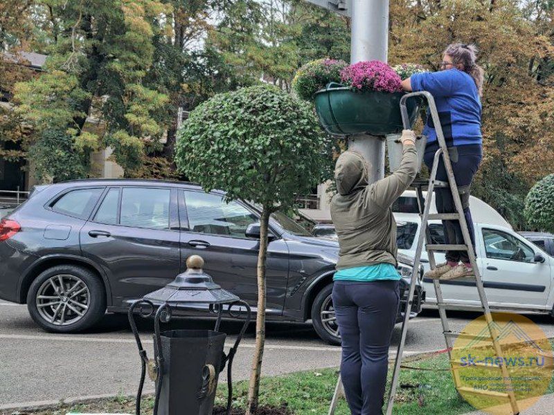 На подвесных вазонах сейчас активно меняют отцветающие петуньи на хризантемы. В два раза увеличат количество подвесных конструкций, в них разместятся более 600 ампельных хризантем.