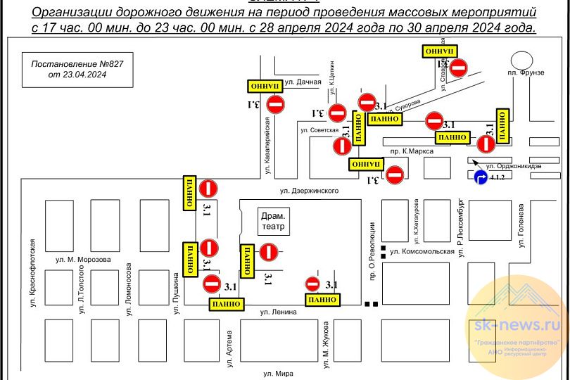 Во время второго всероссийского фестиваля «Школьная весна», в котором примут участие более 1200 ребят из 70 регионов России, проехать будет нельзя по улице Советской, Булкина, Артема от Ленина до Дзержинского,М. Морозова от Пушкина до Артема,Кавалерийской от Дачной до Дзержинского,Дзержинского от Пушкина до проспекта Октябрьской Революции,проспекту Октябрьской Революции от Дзержинского до Советской, Суворова от Советской до Ставропольской, проспекту К. Маркса от Голенева до проспекта Октябрьской Революции, сообщает