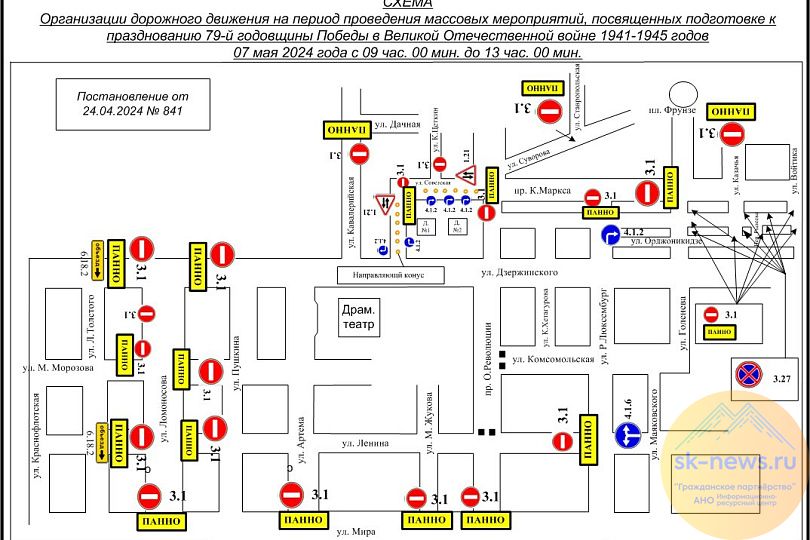По этим же улицам, а также по Казачьей от Горького до Орджоникидзе, переулку Рылеева от Орджоникидзе до проспекта К. Маркса, проспекту К. Маркса от Голенева до Войтика нельзя будет проехать с 9 утра до 13 часов 7 мая.