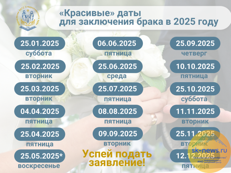 Среди «красивых» дат – 04.04.2025, 06.06.2025 и 08.08.2025, 09.09.2025, 10.10.2025, 11.11.2025, 12.12.2025. Они, наверняка, будут востребованы.