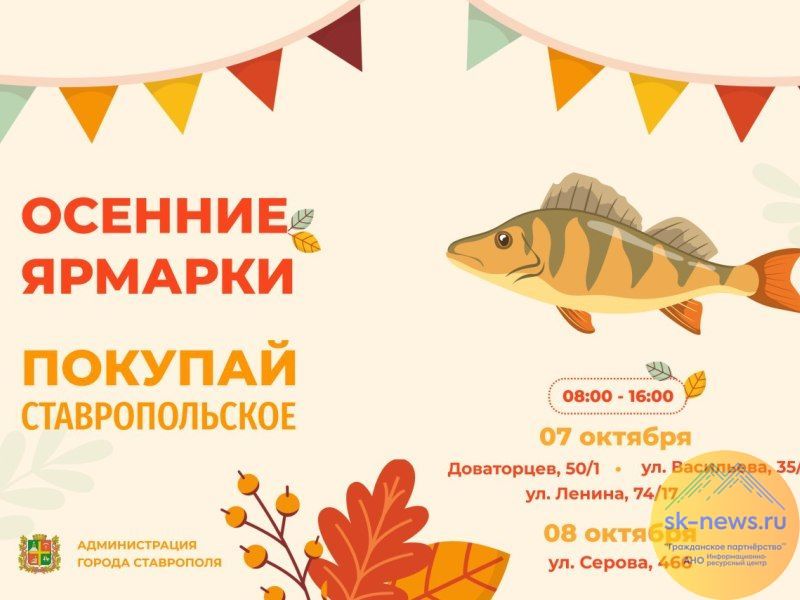 Купить ставропольские товары в субботу 7 октября можно будет по адресам улица Доваторцев, 50/1, ул. Васильева, 35/1, ул. Ленина, 74/17. В воскресенье торговать будут на ул. Серова, 466. Время работы всех ярмарок – с 8 до 16 часов.