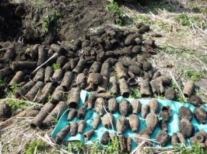 Но дело в том, что вес найденных в Заюково гранат значительно больше – целых два кг. Превышают известные размеры и их габариты. Пробка со штырем (он служил стабилизатором) в нашем случае представляет из себя обычную деревянную затычку, вырезанную армейскими умельцами, сам штырь – кусок проволоки. Отверстие, куда вкручивался ударник, также забито аналогичным способом. Помимо гранат имеются еще и снаряды, судя по калибру (76.2 мм) от полевой скорострельной пушки образца 1902 года, более известной как «трехдюймовка». Это легкое полевое артиллерийское оружие активно использовалось в Русско-японской, Первой мировой, гражданской войне.