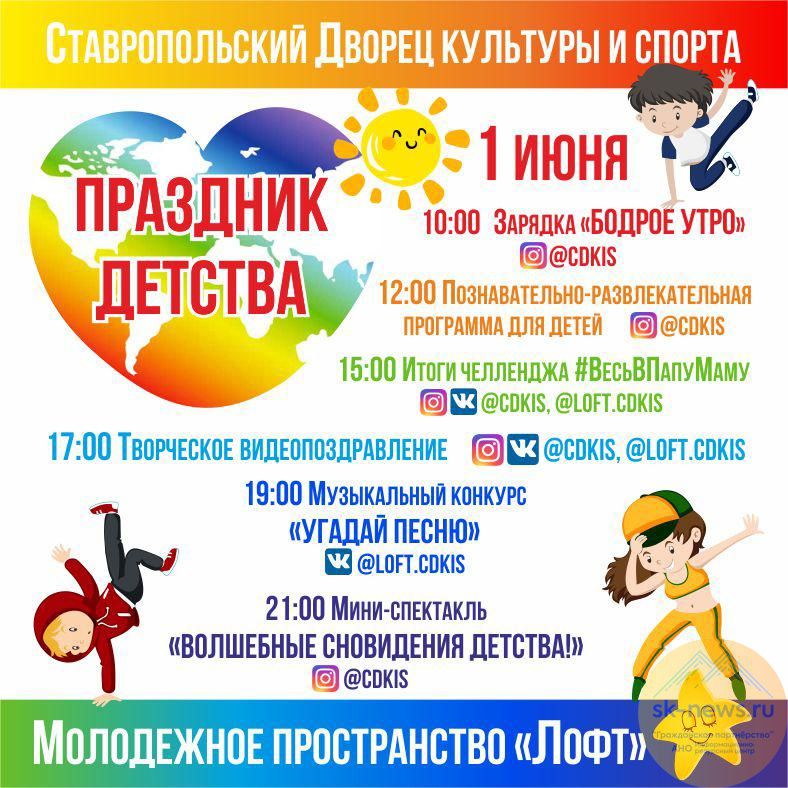 1 июня в аккаунтах ставропольского дворца культуры и спорта состоится «Праздник детства». SK-NEWS.RU публикует подробную программу мероприятий.