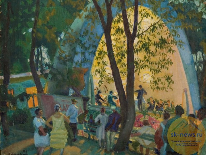 На главном фото – работа Ю.В Разумовской «Концерт в парке Ессентуки» 1929 г., на фото внизу – И.Б. Хоронько «Зимний Бештау» 2011 год, холст, масло; А.Б. Авакимян «Санаторий Нарзан. Нарзанные ванны» картон, масло; «Кисловодск. Коллонада» 1979 год. Холст, масло