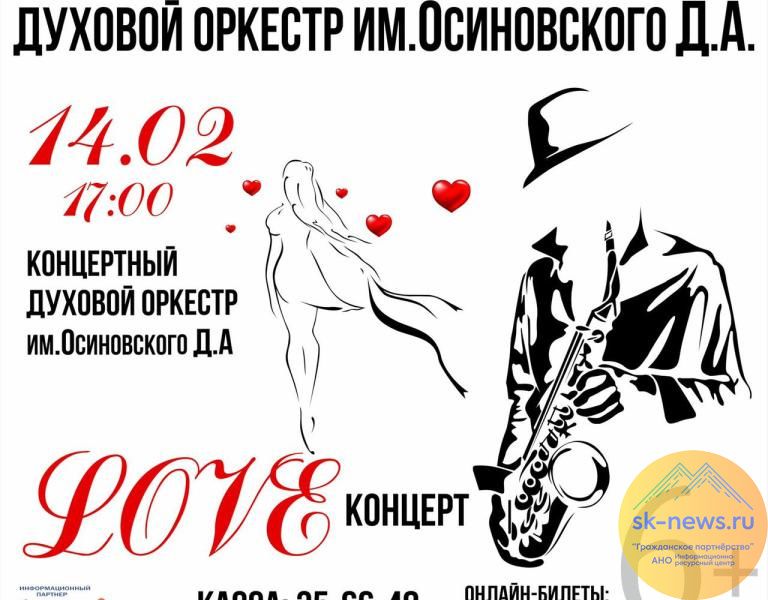 Музыканты и солисты духового оркестра имени Даниила Осиновского 14 февраля покаут «LoveКонцерт» – разговор о любви на языке. В концертном зале Ставропольского Дворца культуры и спорта прозвучат композиции о высоком, сложном и самом невероятном чувстве на земле.