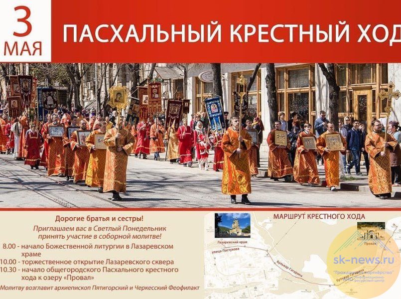В 10 часов утра состоится открытие обновлённого Лазаревского сквера вокруг старинного храма. По окончании торжественной церемонии жители и гости Пятигорска с пасхальными песнопениями, иконой святителя Игнатия, в сопровождении передвижной звонницы направятся к озеру Провал.