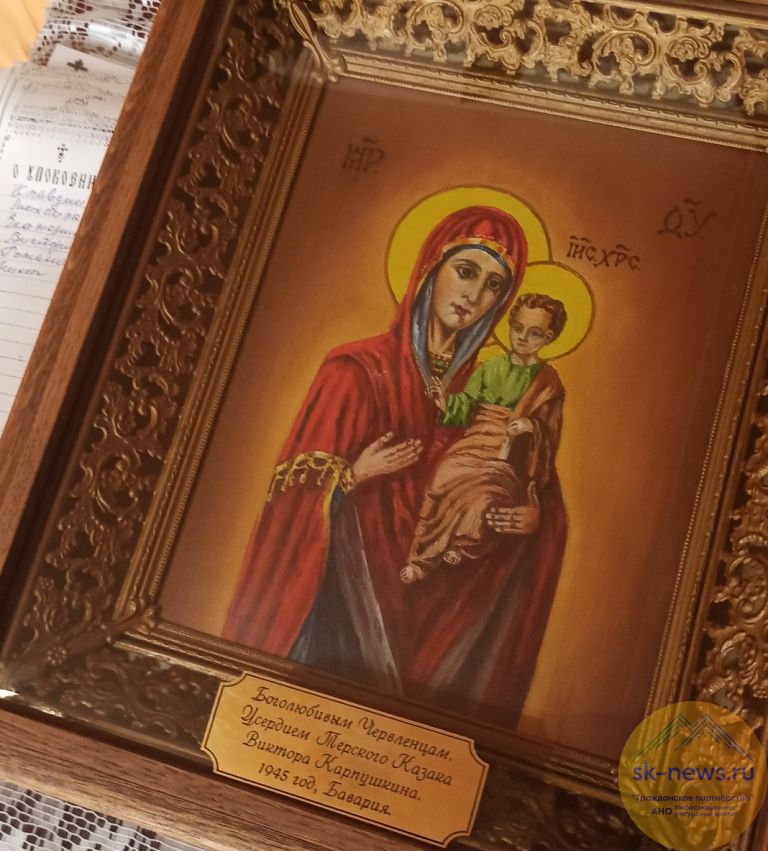 Атаман Терского войска Виталий Кузнецов рассказал SK-NEWS.RU: «Иконе 76 лет. Она побывала в Германии, Италии, Бразилии, США, Чехии, разделяя непростую судьбу Виктора Карпушкина и его семьи. Перед образом они просили заступничества у Матери Божией. Осенью Виктору Карпушкину исполнилось бы 120 лет, в знаменательный юбилей по благословению митрополита Ставропольского и Невинномысского Кирилла, архиепископа Махачкалинского и Грозненского Варлаама передаю в дар православным жителям станицы Червленой эту икону».