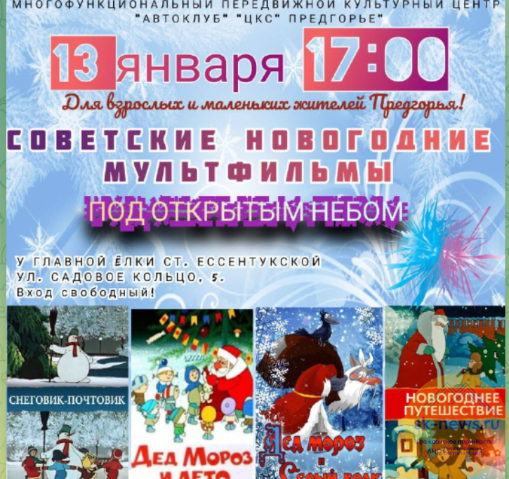 Показ мультиков времен СССР у главной новогодней елки станицы Ессентукской организовало управление культуры администрации округа. Мультфильмы «Дед Мороз и Серый волк», «Снеговик-почтовик», «Новогодние путешествия» и другие показали на экране автоклуба, который приобрели в рамках национального проекта «Культура».