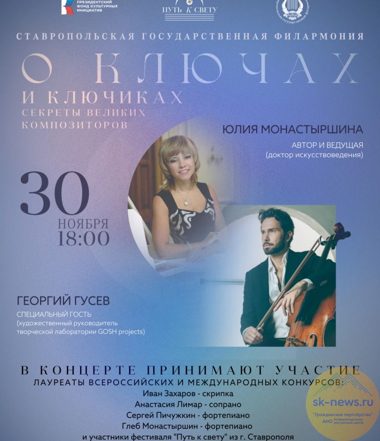 В концерте «О ключах и ключиках. Секреты великих композиторов» примут участие лауреаты всероссийских и международных конкурсов Иван Захаров (скрипка), Анастасия Лимар (сопрано), Сергей Пичужкин, Глеб Монастыршин (фортепиано). Перед аудиторией выступят и участники фестиваля «Путь к свету» из города Ставрополя.