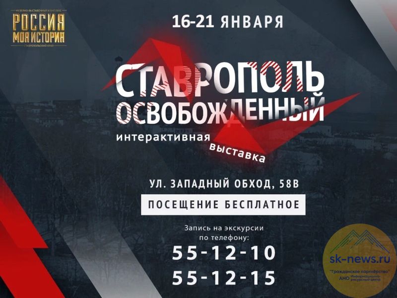 Бесплатная мультимедийная выставка «Ставрополь освобожденный» будет работать с 16 по 21 января. История оживет в кадрах советской и немецкой кинохроники, фотографиях, рисунках, документах, записанных на видео воспоминаниях детей войны. Посетители узнают, какие части Красной Армии и партизанские соединения участвовали в освобождении Ставрополя, кто из бойцов и командиров отличился при штурме, расскажут об отважном командире Иване Булкине и юном патриоте Геннадии Голеневе, чьими именами названы улицы.
