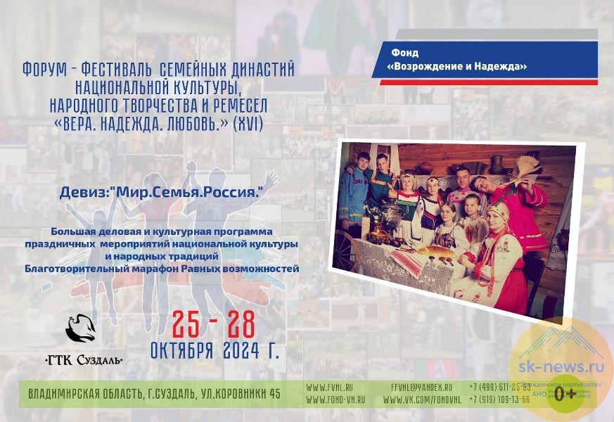 Форум «Вера. Надежда. Любовь» пройдет с 25 по 28 октября во Владимирской области. Фестиваль семейных династий, национальной культуры, народного творчества и ремесел проведёт Фонд помощи талантливым детям, молодежи и инвалидам, поддержки и продвижения социальных, образовательных, культурных и спортивных проектов «Возрождение и надежда» под девизом «Мир. Семья. Россия».