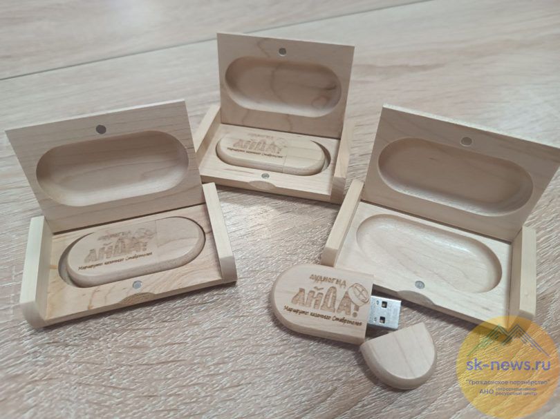 Флешки находятся в коробочках, вместе с которыми они выполнены из дерева. На поверхности флешек и коробочек нанесена художественной резьбой символика проекта и Фонда президентских грантов.