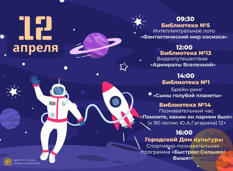 Учреждения культуры подготовили для жителей столицы края праздничную программу. В библиотеке-филиале №1 в 14 часов начнется брейн-ринг «Сыны голубой планеты». Участники посоревнуются в знаниях и умении быстро и правильно отвечать на вопросы об истории российской космонавтики и покорителях космоса, рассказали