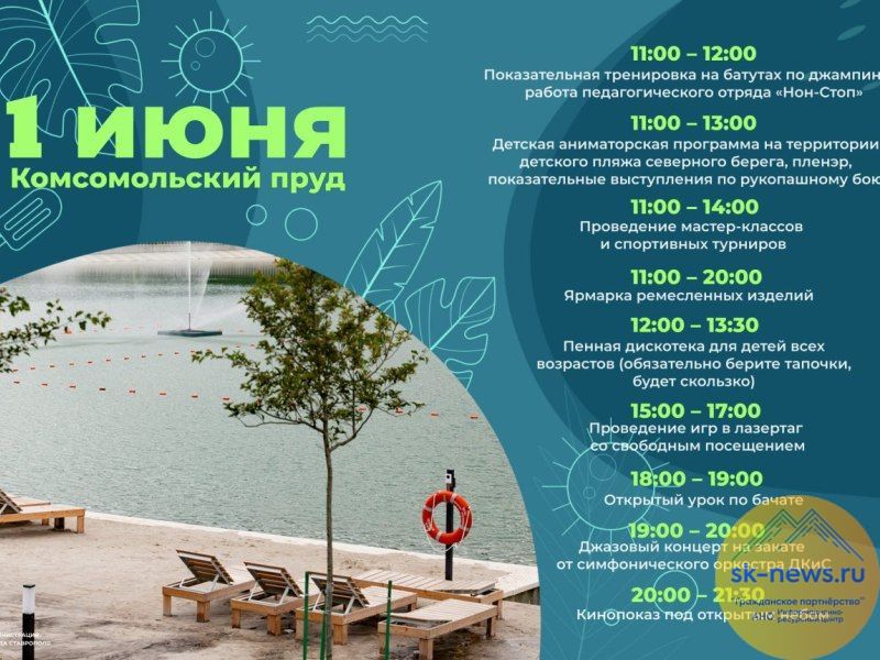 С 11 часов до полудня пройдет показательная тренировка на батутах по джампингу, детвора сможет отлично провести время с педагогическим отрядом «Нон-Стоп». С 11 до 13 часов ребят ждет развлекательная программа с вожатыми, веселые игры с аниматорами на детском пляже северного берега. Мальчишки и девчонки смогут сделать тематический аквагрим, присоединиться к пленэру и увидеть показательные выступления по рукопашному бою.