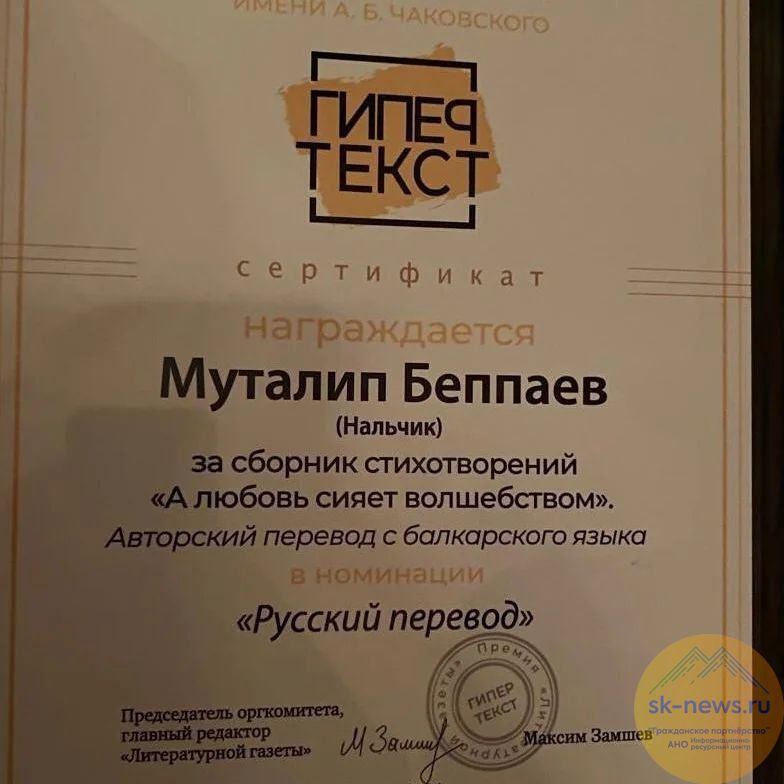 Народный поэт КБР Муталип Беппаев стал победителем в номинации «Русский перевод» – за авторский перевод с балкарского языка сборника стихотворений «А любовь сияет волшебством».
