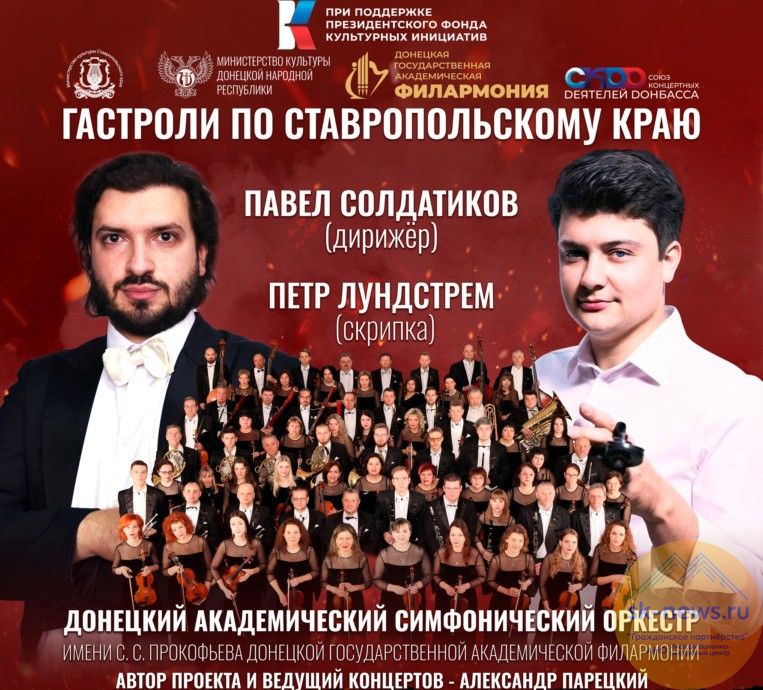 В зале Дворца культуры города Донецкий академический симфонический оркестр имени Прокофьева в рамках проекта «Оркестр непокорённых» представит грандиозную симфоническую программу под управлением дирижёра Павла Солдатикова с участием скрипача-виртуоза Петра Лундстрема. Событие реализуется при поддержке Президентского фонда культурных инициатив.