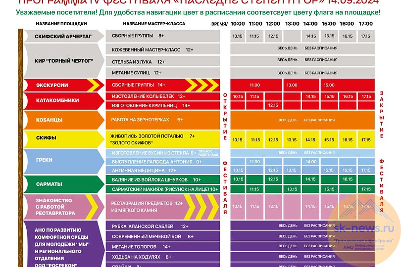 С 10.00 гостям праздника предлагают узнать больше о древней истории Северного Кавказа и познакомиться с её аутентичностью. В этом году на фестивале появится новая локация, которая познакомит посетителей с профессией реставратора. Благодаря Фонду в этом году здесь пройдут практические занятия по очистке найденного на раскопках настоящего каменного половецкого изваяния от загрязнений.