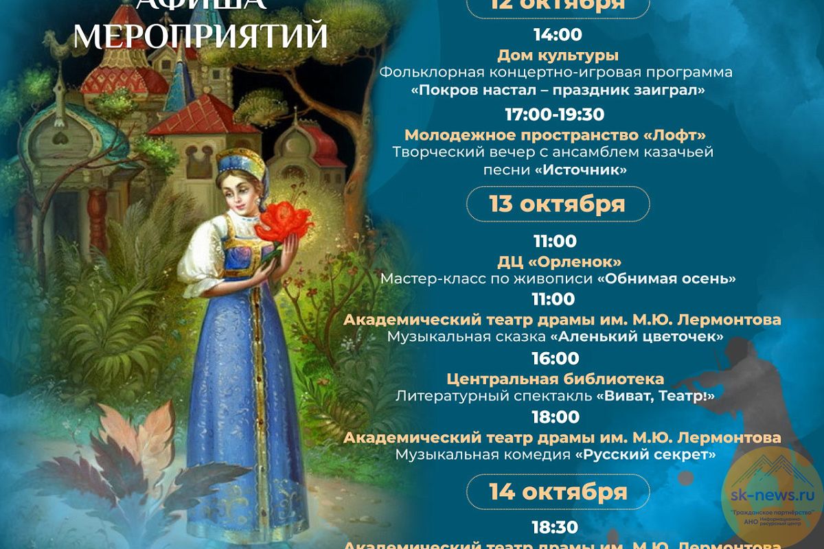В преддверии праздника Покрова 12 октября в 14.00 в городском Доме культуры ставропольские творческие коллективы представят музыкально-игровую программу «Покров настал – праздник заиграл». Гости узнают об истории праздника, его традициях, смогут насладиться народными песнями, поучаствовать в хороводах и играх. Мероприятие – участник программы «Пушкинская карта».