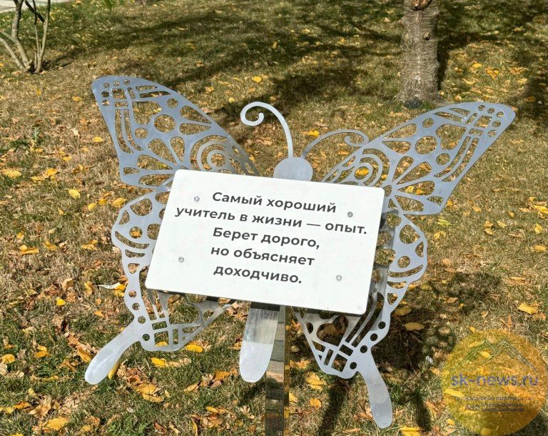 На клумбах парка появились красивые арт-объекты в виде бабочек с приведенными словами и мудрыми мыслями философов древности и выдающихся ученых прошлых веков.