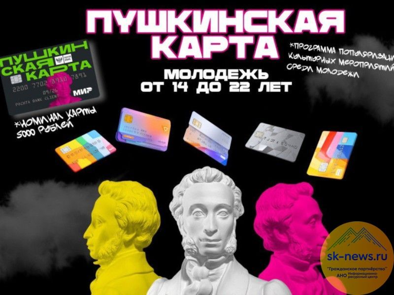 Всего в прошлом году по программе «Пушкинская карта» муниципальные учреждения культуры Ставрополя реализовали более 11,5 тысячи билетов, коммерческие кинотеатры продали 73 тысячи билетов. Получить карту могут юноши и девушки 14-22 лет. Для этого нужна регистрация на портале «Госуслуги», подтверждение учетной записи с помощью онлайн-банков или в центрах обслуживания, скачайте приложение для просмотра афиши событий и остатка средств, подтвердите выпуск и получите виртуальную или пластиковую карту «Мир».