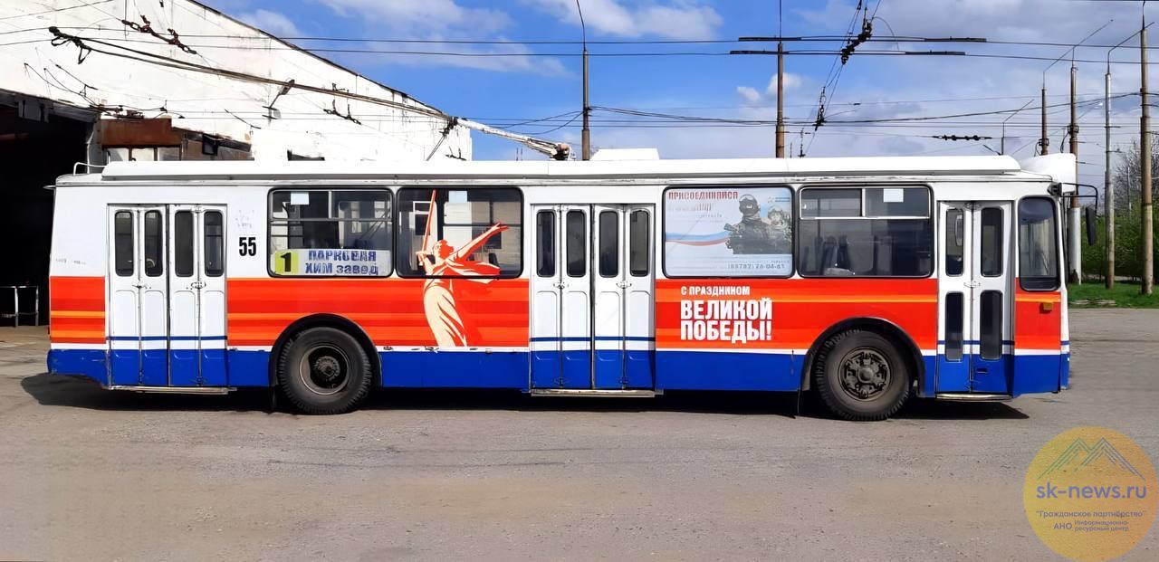 Преобразился городской транспорт- автобусы и троллейбусы украшены георгиевскими лентами, флагами и праздничной символикой, сообщает