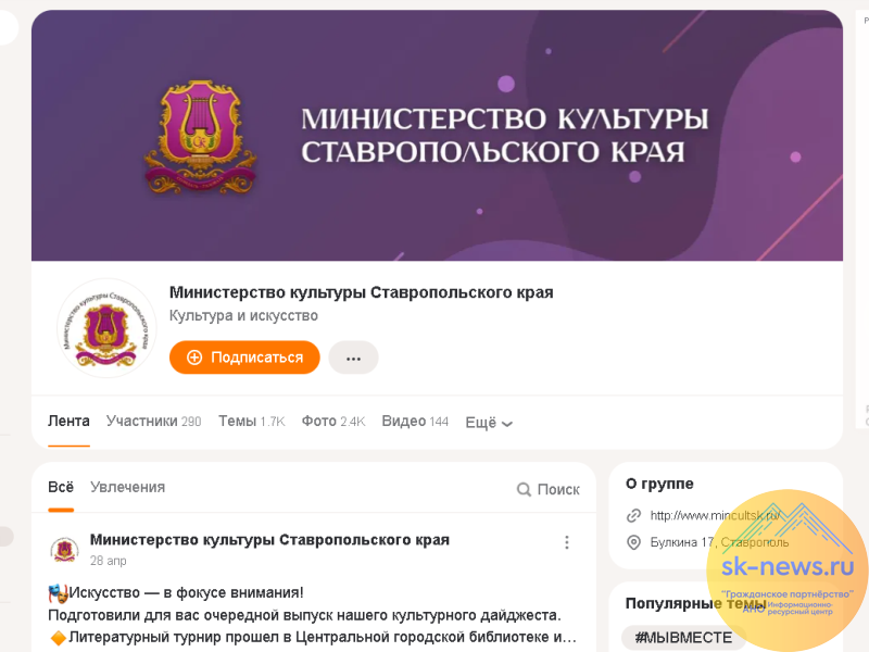 Следите за новостями минкультуры Ставрополья во «ВКонтакте» и «Одноклассниках». Учреждения культуры края активно осваивают цифровые платформы для общения с аудиторией. Свои страницы создали 280 музеев, театров, библиотек, домов культуры, школ искусств.