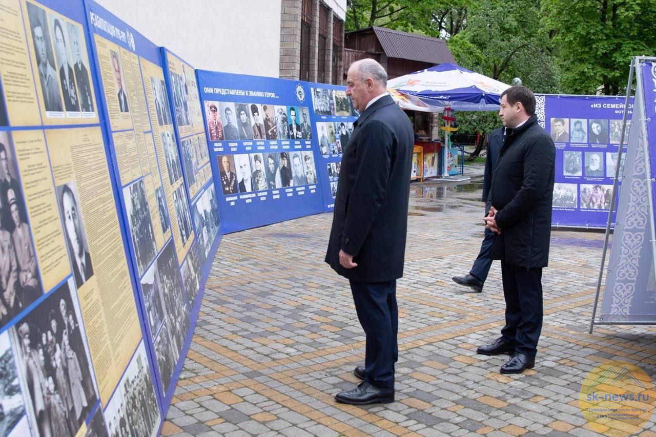 Возле амфитеатра открылась тематическая выставка. На ней были представлены старинные фотографии, отражающие события тех лет, а также биографии выдающихся представителей карачаевского народа. Среди них — Герои Советского Союза, России и Социалистического труда, а также члены делегации, которые способствовали возвращению карачаевского народа из Средней Азии и Казахстана.
