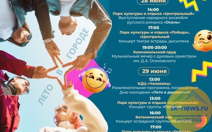 В воскресенье в 13.00 в культурном центре «Чапаевец» стартует развлекательная программа «Лето в движении». Яркие впечатления и интересные активности зарядят гостей праздника и подарят по-настоящему летнее настроение. В это же времяв Центральном парке начнется концерт группы «Позитив», а в 15.00 здесь же выступят артисты группы «ГармониЯ».