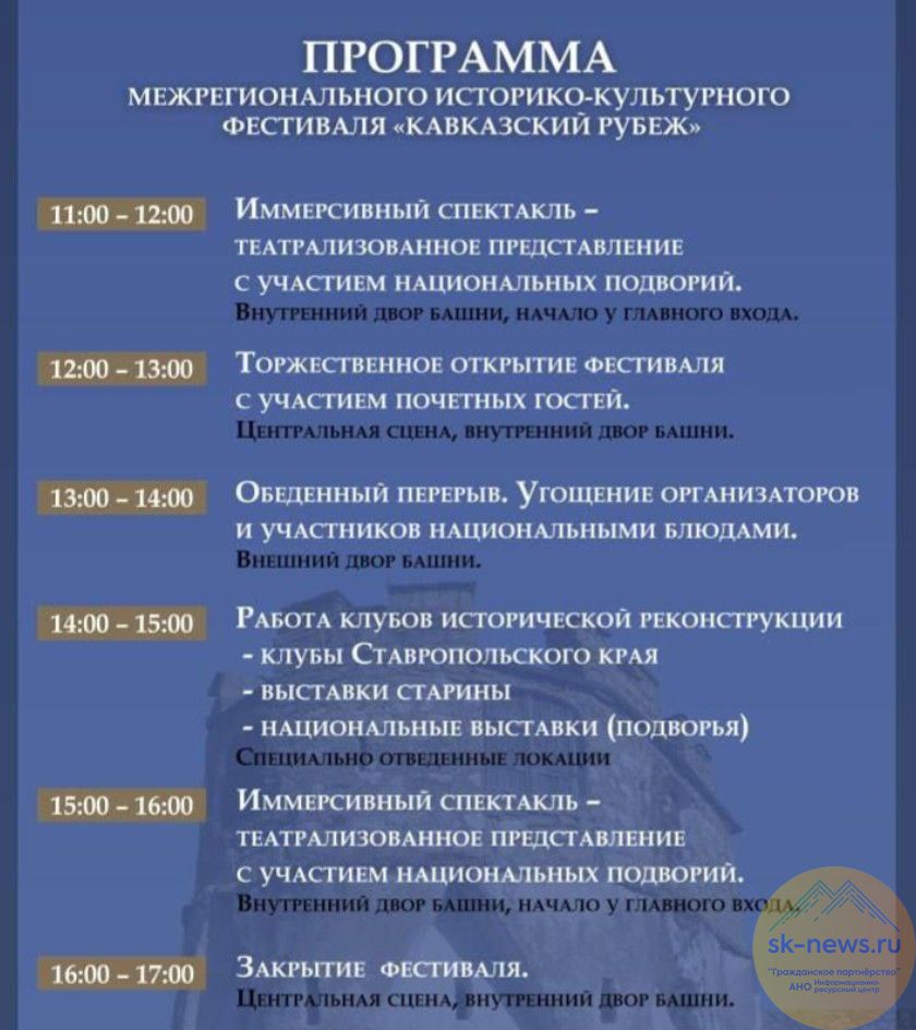 Гостей ждут этнодеревня с бытом народов Карачаево-Черкесии, ремесленные мастерские, иммерсивный спектакль с погружением в историю, реконструкторы из Ставропольского края в подлинной одежде и с оружием, концерт на народных инструментах и угощения национальной кухни.