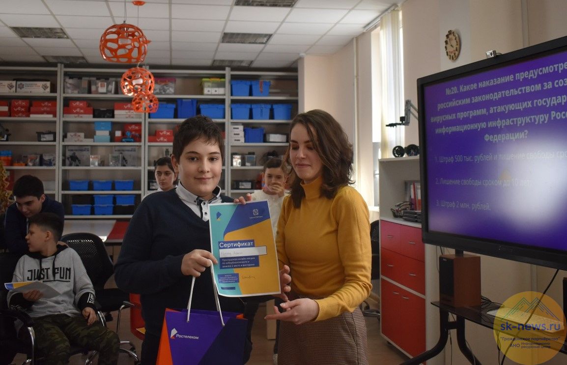После образовательной лекции специалисты «Ростелекома» проверили знания и навыки учеников с помощью тестов. И в завершение встречи они рассказали кванторианцам о полезном сервисе для школьников – интернет-платформе дистанционного обучения «Ростелеком Лицей». Каждый слушатель лекции получил сертификат участника, а победители-конкурсанты – еще и памятные подарки от национального цифрового провайдера.