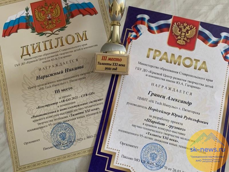 В номинации «Робототехника и интеллектуальные системы» краевого конкурса-выставки научно-технического творчества молодежи «Таланты XXI века» представили проекты воспитанников ЦМИТ «HI-Tech Импульс» из Пятигорска. Призовое 3-е место занял проект Никиты Нарыжного «Конструктор «АR-GO» 2021 – «CAR-GO». Поощрительной грамотой минобразования Ставрополья отмечен проект Александра Гринца «Шаробот-грузовоз», разработанный под руководством наставника центра Юрия Нордгеймера. Регион – один из передовых по развитию центров молодежного инновационного творчества, в нём десять центров, сообщали «Северо-Кавказские новости».