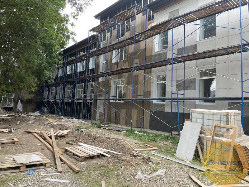 Фасад школьного здания в станице Воровсколесской обшивают декоративной плиткой, ведутся кровельные работы. На стенах и полу коридоров уложат плитку, покрасят стены кабинетов, смонтируют подвесные потолки.