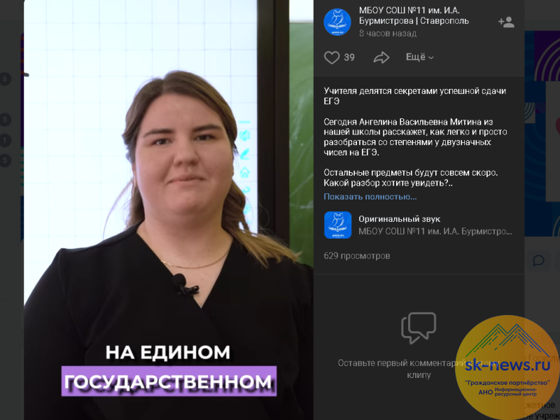Первой присоединилась к проекту школа №11 имени И.А. Бурмистрова. Учитель математики Ангелина Митина в формате ВК-клипа рассказала ребятам о том, как легко разобраться с возведением двузначных чисел в степень.