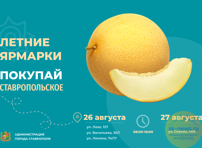 Гости и ставропольцы смогут купить спелые персики, дыни, арбузы, яблоки, баклажаны и другие местные бахчевые и фруктово-ягодные плоды. В изобилии будет овощная продукция по доступным ценам: красный перец, картофель, морковь, лук, свекла, помидоры.
