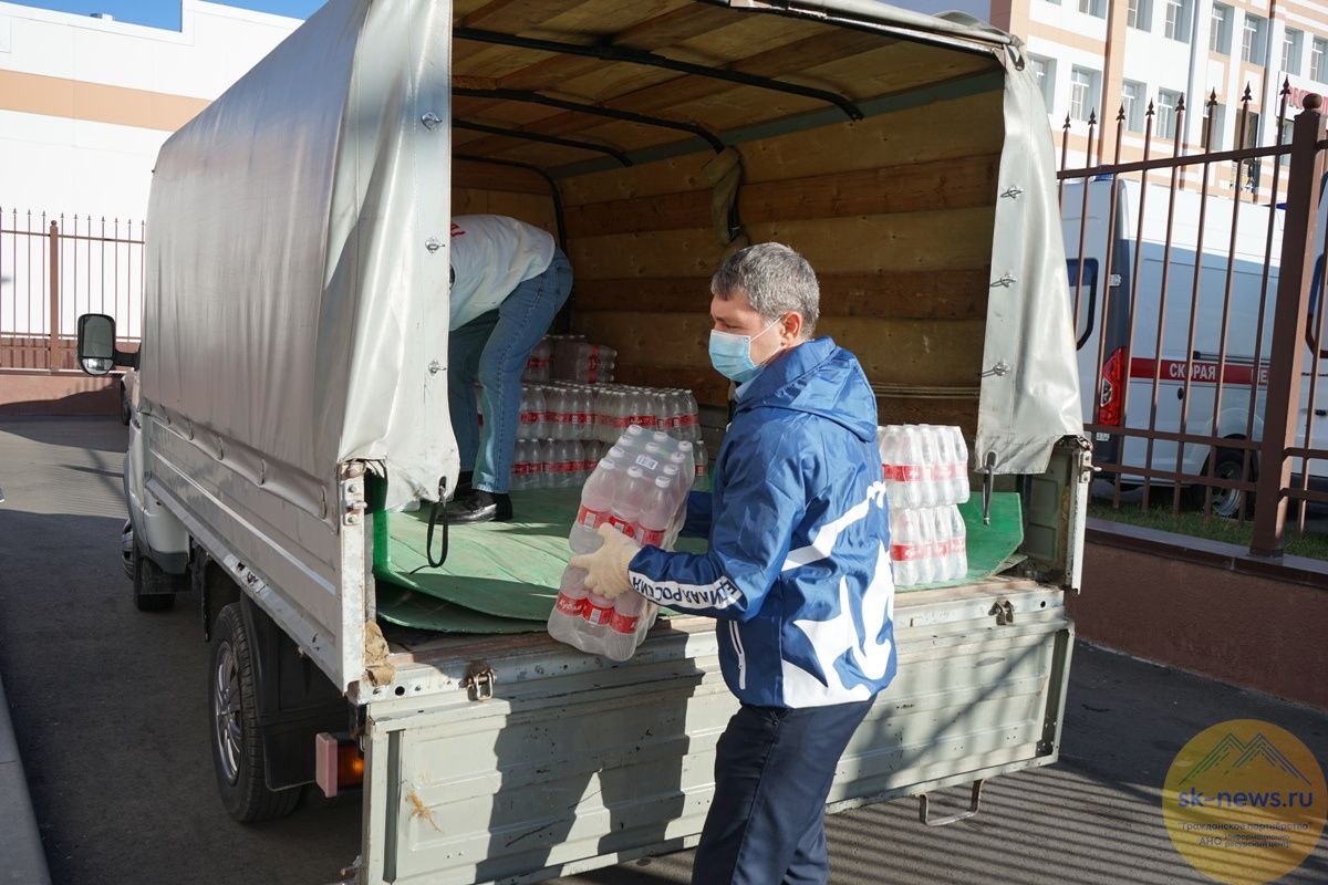 Пять тысяч бутылок воды объемом 0,5 л., которые в Волонтерский центр Партии предоставила компания «Меркурий», сегодня волонтеры отвезли в ковид-госпитали на базе Городской поликлиники Черкесска и в микрорайоне Северный. Часть передали в Центр гигиены и эпидемиологии.