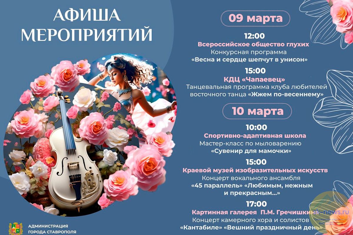 Праздничные активности для горожан подготовило ставропольское отделение Всероссийского общества глухих, в котором 9 марта в 12.00 начнется конкурсная программа «Весна и сердце шепчут в унисон», и спортивно-адаптивная школа, где в воскресенье в 10.00 все желающие смогут принять участие в мастер-классе по мыловарению. А для школьников в субботу в центре воспитательной работы Промышленного района по улице Родосской, 3 пройдет познавательная игра «Весенние забавы». Начало в 11.30.