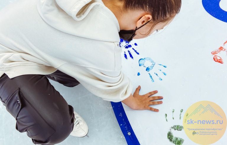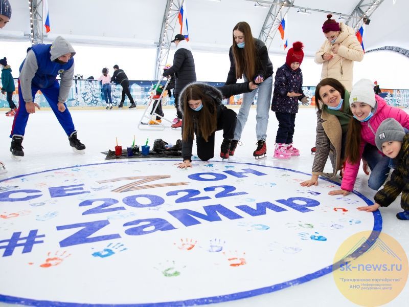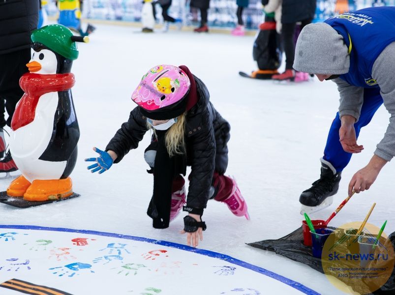 В этом году для посетителей прошла акция «За Мир». Люди оставляли отпечаток руки на баннерах в середине катка при каждом сеансе. Взрослые и дети яркими красками сохранили след на полотне надежды, прокатились с флагом России и сделали памятные фотографии.