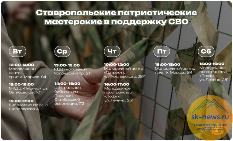 «Мы постоянно ищем новые способы поддержки наших военнослужащих… Поэтому объявляем о запуске семи муниципальных патриотических мастерских. Эта инициатива направлена на то, чтобы у каждого жителя было больше возможностей помочь», — подчеркнул глава Ставрополя Иван Ульянченко. Первая встреча в рамках этого проекта состоится уже 20 января.